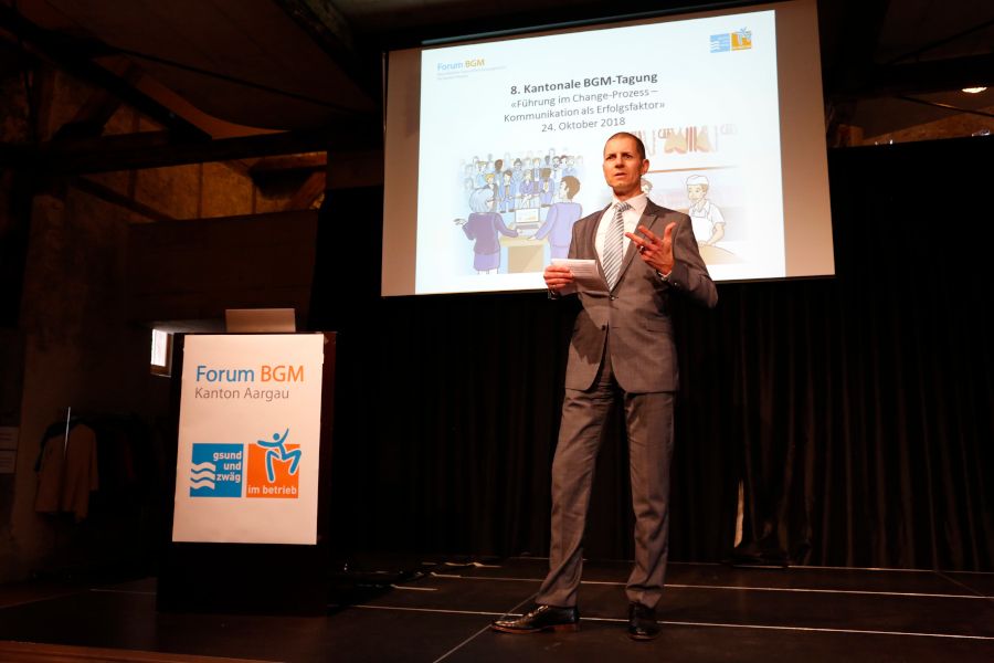 An der 8. Kantonalen BGM-Tagung zum Thema «Führung im Change-Prozess – Kommunikation als Erfolgsfaktor» erhielten die Teilnehmenden fachliche Inputs, Tipps und Anregungen für den Führungsalltag. Rund 160 Personen aus Wirtschaft, Wissenschaft und Politik besuchten den Anlass in Villigen.